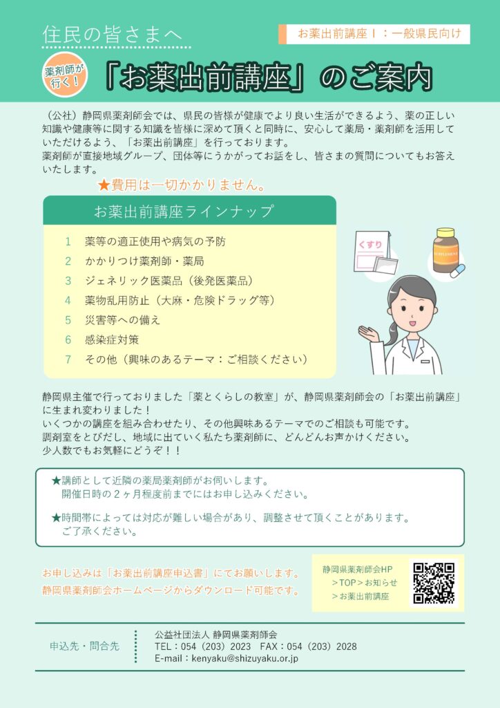 私たち静岡県薬剤師会では、薬の正しい使い方を地域の皆様に知っていただく目的で、お薬出前講座を行なっております。