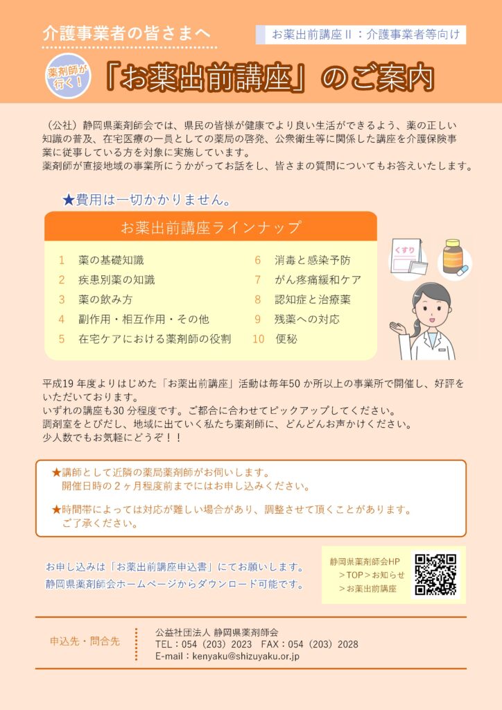 「お薬出前講座」のご案内(講座Ⅱ【介護事業者向け】)&「お薬出前講座」申込書(PDF形式 248KB)